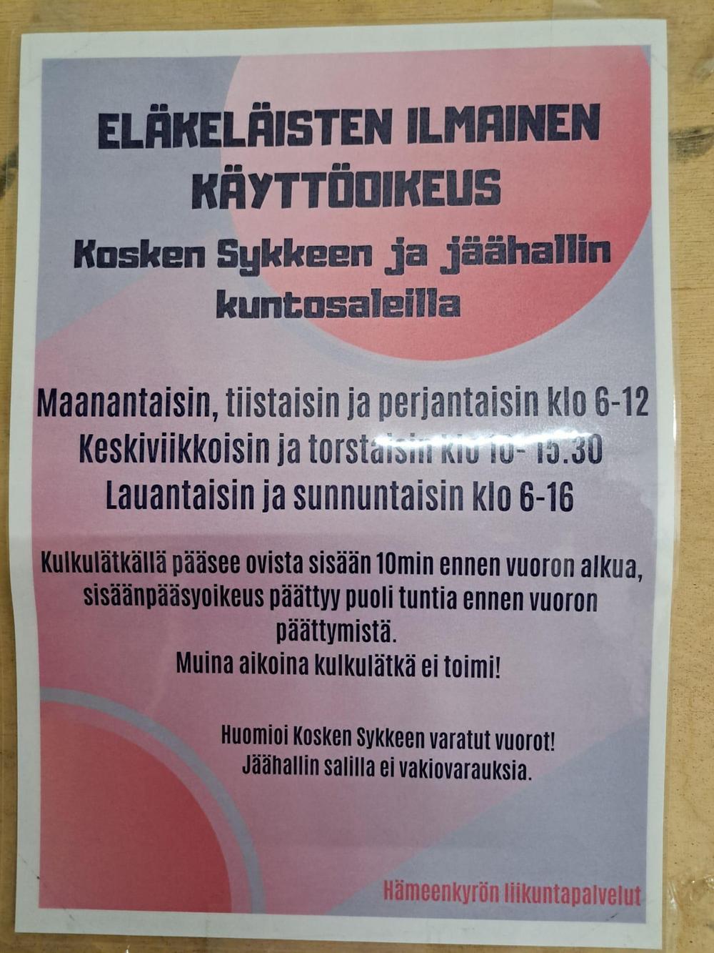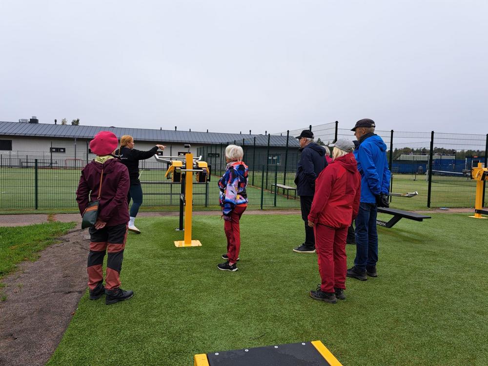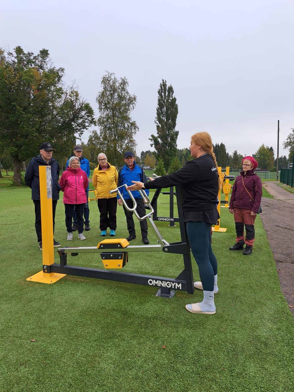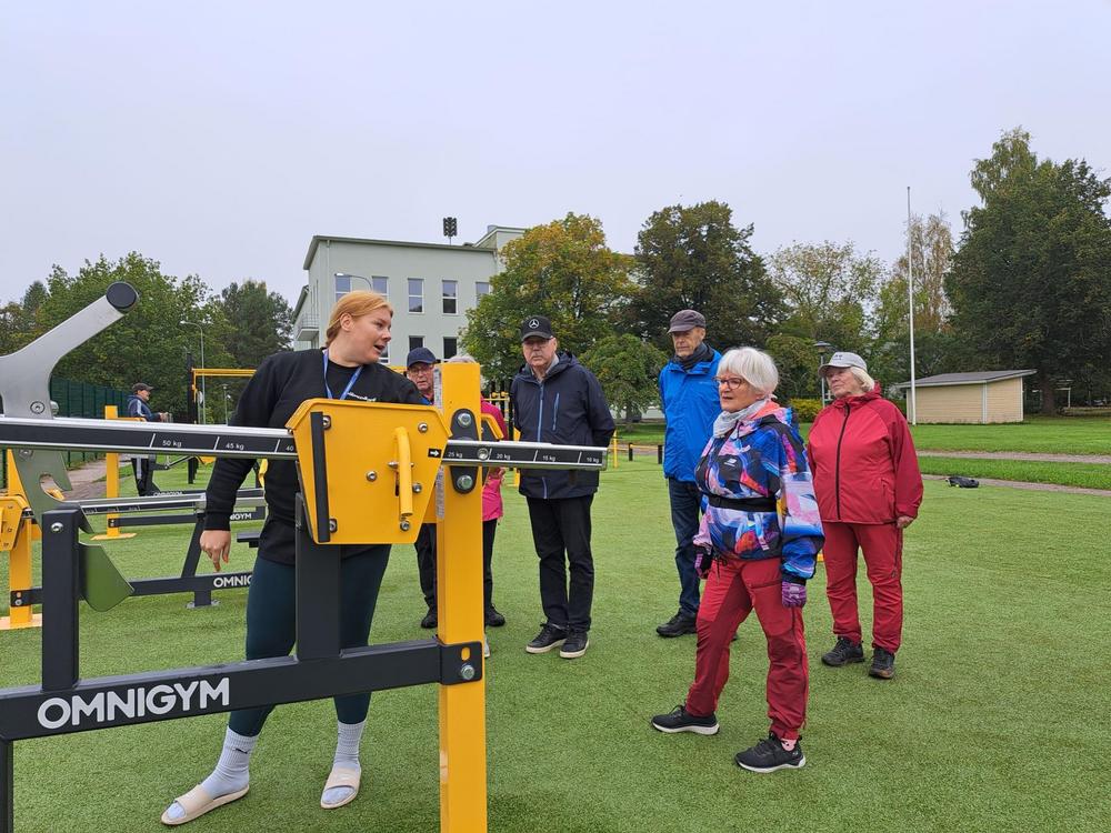 Iloinen yhdeksän seniorin joukko kokoontui kyläkävelylle. Hämeenkyrön liikunnanohjaaja Petra Jokinen opasti meidät Kyröskosken urheilukentän lähistöllä olevan ulkokuntosalin laitteisiin, ja kävimme myös jäähallin kuntosalilla tutustumassa sen tarjoamiin mahdollisuuksiin. On hyvä muistaa, että eläkeläisille jäähallin ja Sykkeen kuntosalit ovat ilmaisia tietyinä aikoina. Kuvista löytyy tarkat päivät ja kellonajat, jolloin sisäänpääsy on maksuton.