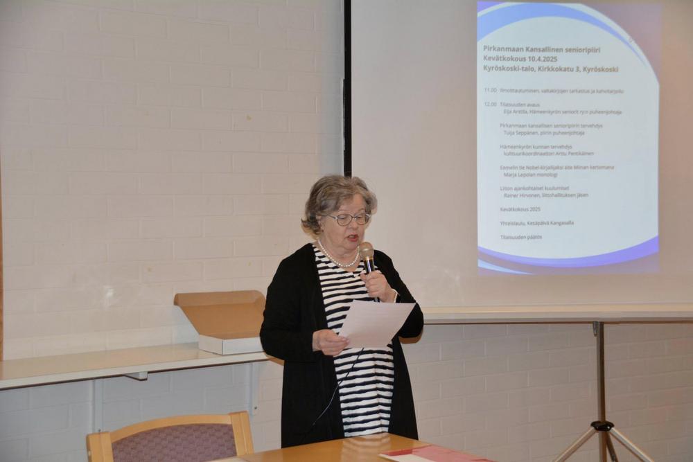Pirkanmaan senioriväki kokoontui torstaina 10. huhtikuuta kevätkokoukseen Hämeenkyrön Kyröskoski-talolle. Tapahtuma käynnistyi lämminhenkisissä merkeissä, kun Hämeenkyrön senioreiden puheenjohtaja Eija Anttila toivotti osallistujat tervetulleiksi. Piirin kuulumiset ja terveiset kokousväelle toi piirin puheenjohtaja Tuija Seppänen.