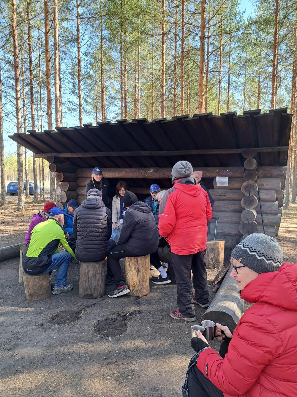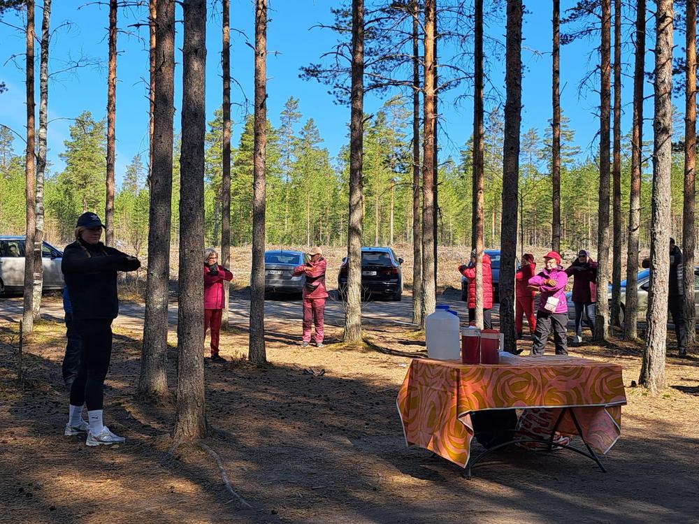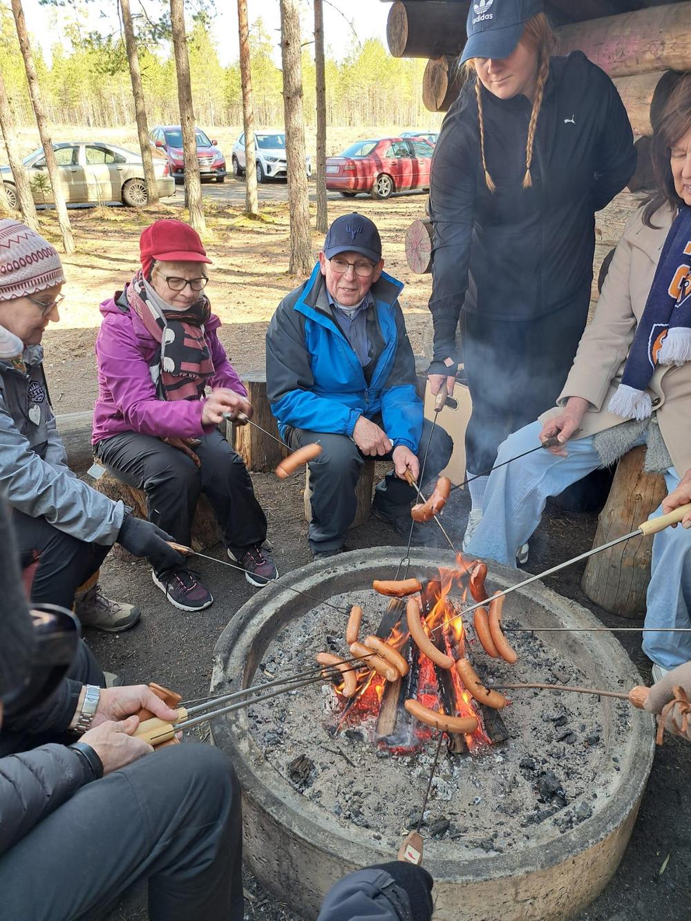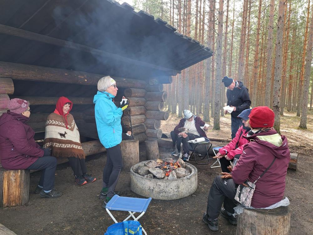 Kyläkävely alkoi torilta ja suuntasimme lentokentän maisemiin keväästä nauttien. Ennen kävelylle lähtöä Netta ohjasi meille virkistävän alkulämmittelyn, ja reippailun päätteeksi makkara ja mehu maistuivat nuotion äärellä – samalla vaihdettiin kuulumisia ja nautittiin yhteisestä hetkestä luonnon helmassa.