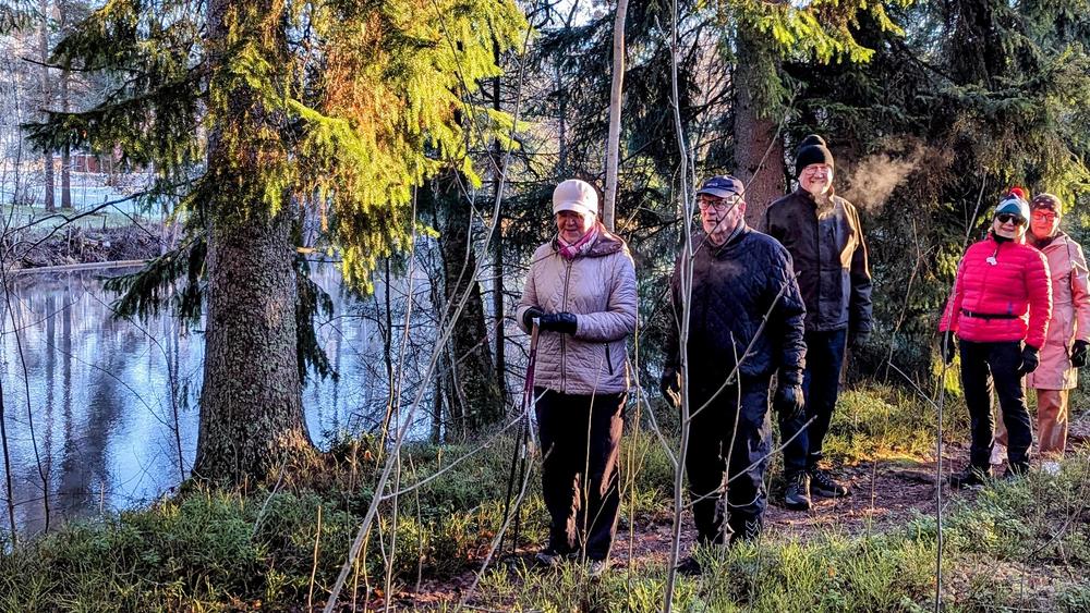 Hämeenkyrön seniorit nauttivat marraskuun raikkaasta aamusta Pappilanjoen rantamaisemissa perjantaina 14.11.2025. Kyläkävely alkoi jätevesipuhdistamon parkkipaikalta ja eteni jokivartta pitkin kohti Hämeenkyrönväylää.