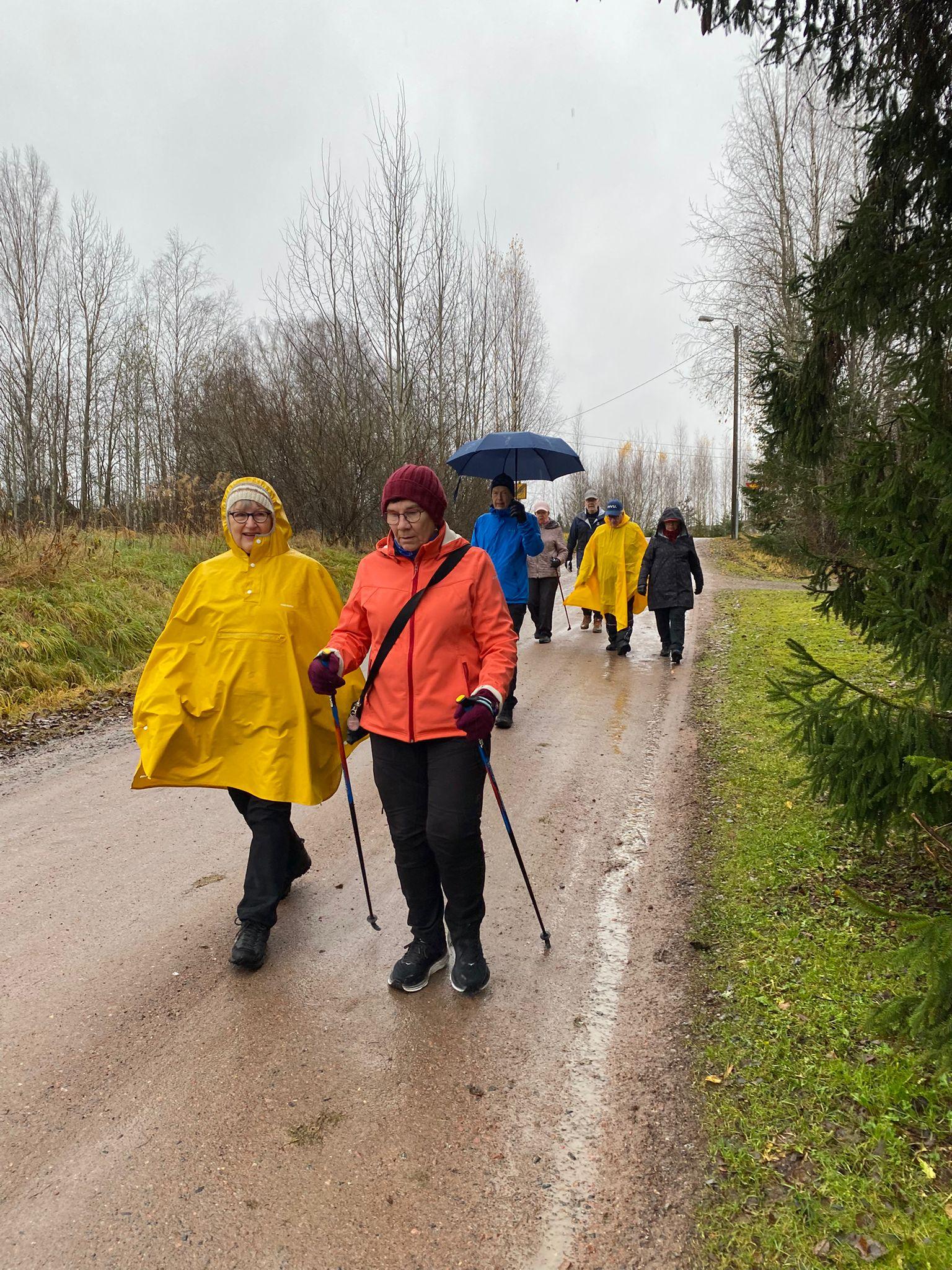 Hämeenkyrön seniorit tekivät perjantaina 31.10. reippaan kyläkävelyn Rantakulmalla Vaikka sää oli sateinen, tunnelma pysyi iloisena.
