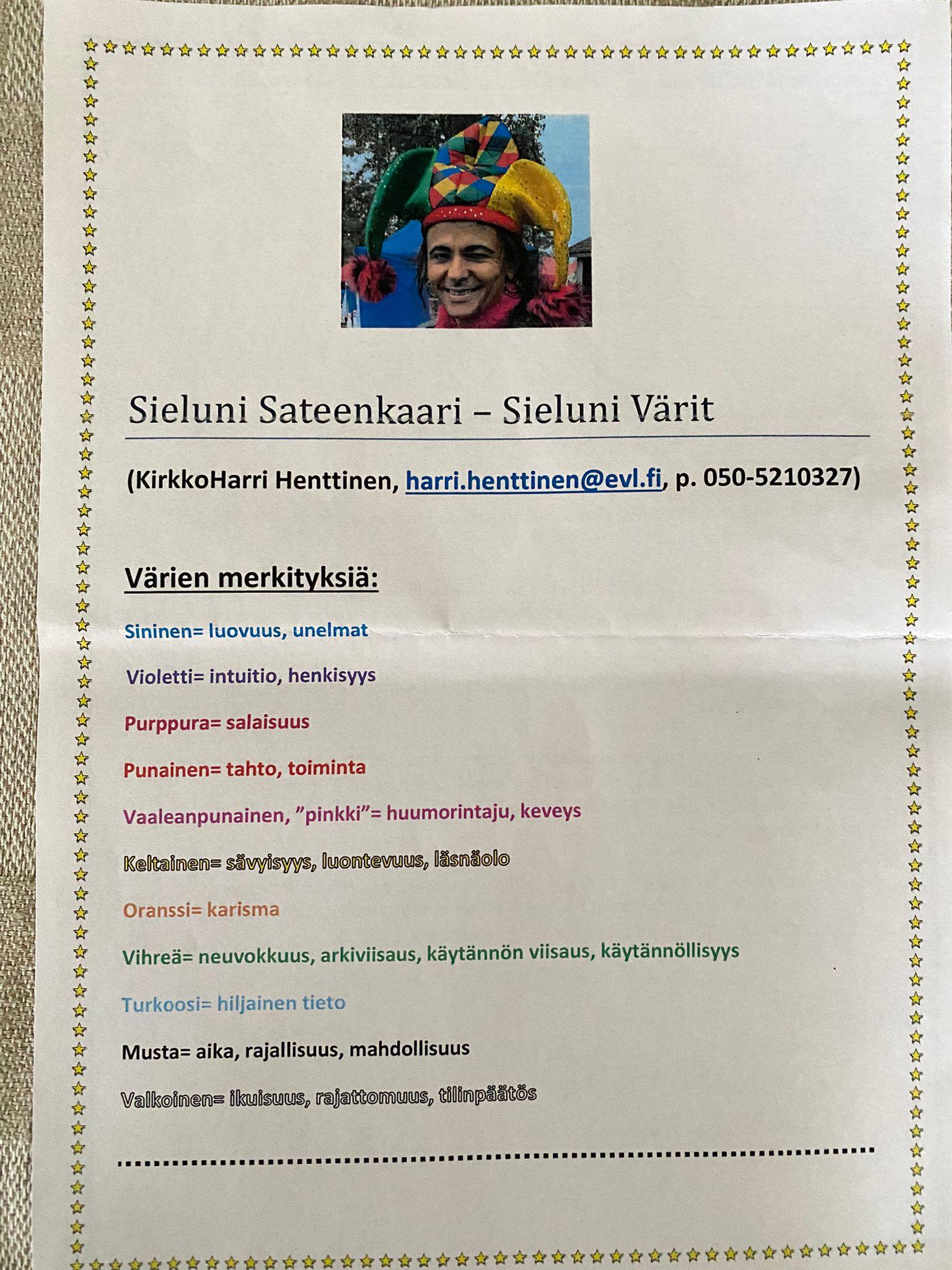 Tilaisuus jatkui seurakuntatalolla, jossa nautittiin kahvit, kuultiin musiikkia ja Harrin esitys “Sieluni värit”. Päivä oli lämminhenkinen ja ajatuksia herättävä – kiitos järjestäjille ja kaikille mukana olleille!
