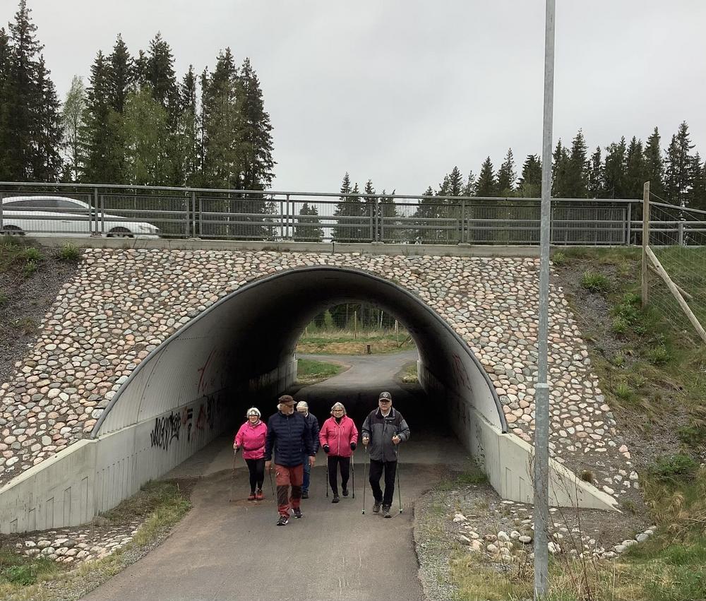 Senioreiden kävelytapahtuman kävelyreitti kulki kahden Vt 3:n alikulkutunnelin läpi. Matkalla ihastelimme isoja keltaisia rentukan kukkia Turkimusojan varressa sekä tapasimme matkan varrella kurjen, pupujussin ja ketun.